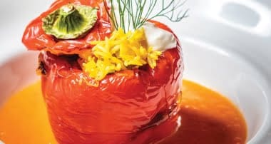 Baked red pepper with pilau rice, tomato sauce and sour cream