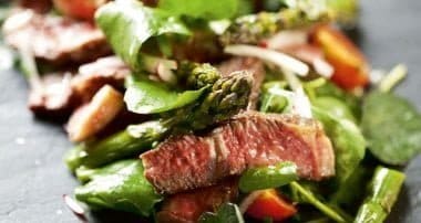 Beef and asparagus salad with honey dressing, radishes and cherry tomatoes