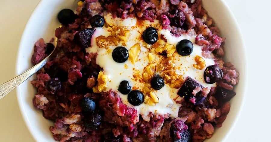 Blueberry & beetroot porridge with chopped walnuts Print Start the day right with this colourful breakfast of blueberry and beetroot porridge, packed full of antioxidants and guaranteed to power you through the day. Author: www.lovebeetroot.co.uk Serves: 4-6 Ingredients 470ml water 100g rolled oats ΒΌ tsp cinnamon (plus more for serving) 200g blueberries, fresh or frozen 3-4 tbsp maple syrup (to taste) salt 2 large cooked beetroot, chopped yoghurt (oat or milk) and chopped walnuts to serve Method Bring the … Continue reading Blueberry & beetroot porridge with chopped walnuts
