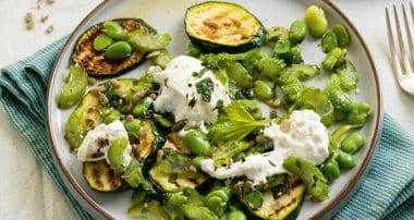 Burrata with grilled courgette, celery & toasted seeds Print Serves: 2 Ingredients 1 tbsp olive oil 1 small courgette, finely sliced into discs 200g broad beans 2 tbsp mixed seeds 1 tbsp cumin seeds 1 tsp honey juice of 1 lemon small bunch fresh mint leaves, finely chopped 2 tbsp extra virgin olive oil salt and pepper 4 sticks celery, thinly sliced and leaves reserved 1 ball burrata Method Heat 1 tbsp olive oil in a griddle pan on … Continue reading Burrata with grilled courgette, celery & toasted seeds