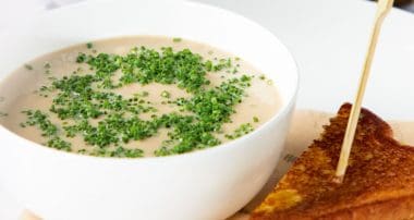 Celeriac and chestnut soup with turkey croque monsieur