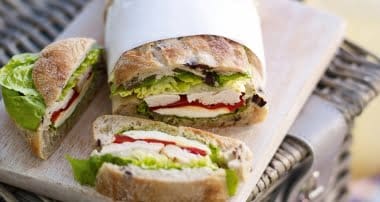 Chicken and mozzarella sandwich loaf Print Author: www.makemoreofsalad.com Serves: 4-6 Ingredients 1 circular loaf 3 tbsp cranberry sauce 6-8 long Cos lettuce leaves 150g mozzarella, sliced 1 jar roasted vegetables (peppers, aubergines, courgettes etc) leftover chicken, torn into pieces Method Cut the top off the loaf approx ΒΌ the way down and pull the soft bread out of the centre to make a bowl shape of the crust with a 2cm layer of bread inside. Spread half the cranberry … Continue reading Chicken and mozzarella sandwich loaf