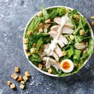 - Serve: Place the salad leaves in a mixing bowl, pour over half the dressing and toss. Place dressed leaves in 4 bowls and top with bacon lardons, chicken, eggs, croutons and grated/shaved Parmesan, Serve with the remaining dressing on the side.