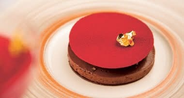 Chocolate and raspberry cardinal Print Author: Helen Doyle Serves: 20 Ingredients 3 leaves bronze gelatine 397g Alto el Sol dark chocolate [65% good quality dark chocolate] 2 eggs 2 egg yolks 227g caster sugar 473ml raspberry puree 650ml whipping cream Chocolate decoration 1kg tempering chocolate 200ml red cocoa butter Chocolate decoration: 1kg tempering chocolate 200ml red cocoa butter Method Place 20 rings (10cmx2.5cm/4”x1”) in the freezer before beginning (use any size ring though this will alter the number of … Continue reading Chocolate and raspberry cardinal