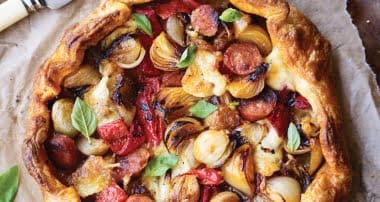 Chorizo and shallot galette Print Serves: 2 Ingredients 100g chorizo, sliced 8 shallots, quartered 1 sheet puff pastry 2 red peppers, sliced 125g mozzarella, torn 1 egg, beaten basil leaves to serve Method Heat oven to 220C/Gas 7. Fry chorizo (no oil) until crisp and set aside. Reduce the heat and fry shallots.Unroll the pastry and trim off the corners so it becomes more circular. Lay it on a non-stick baking tray. Leaving a 3cm border, fork lots of … Continue reading Chorizo and shallot galette