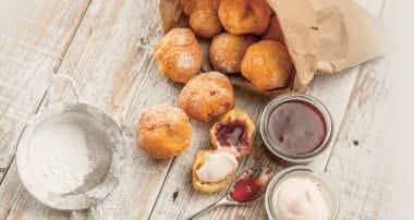 Doughnuts with rose cream and strawberry jam Print Author: Helen Doyle Serves: 12 Ingredients For the doughnuts: 100ml water 35g unsalted butter 70g strong flour 2g salt 5g caster sugar 2 eggs For the rose cream: 600g whipping cream 120g icing sugar 30ml rose water (must taste) To serve: strawberry jam Method For the doughnuts, boil water and butter in a pan. In a bowl, sieve together the flour, salt and sugar before adding to the pan and cooking … Continue reading Doughnuts with rose cream and strawberry jam