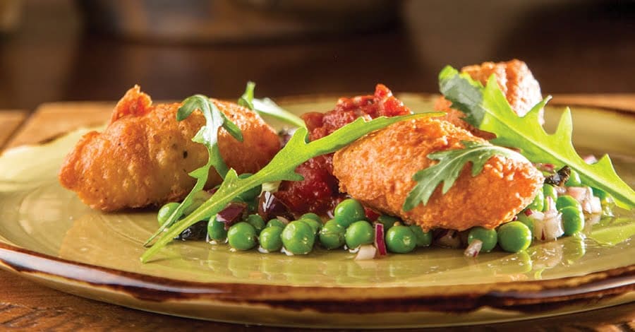 Goat’s cheese beignets, tomato fondue and peas Print Author: Bouchon Bistrot Serves: 6 Ingredients 90g butter 225g water 1 clove garlic, crushed salt and black pepper 115g plain flour 2 eggs 250g Sainte Maure de Touraine goat’s cheese, crumbled To serve tomato fondue garden peas Method Place the butter, water, garlic and salt and pepper into a pan and bring to the boil, making sure the butter is fully melted. Remove from the heat and add the flour … Continue reading Goat’s cheese beignets, tomato fondue and peas