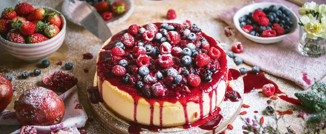 Lemon berry cheesecake Print Serves: 6 Ingredients Base: 250g digestive biscuits 110g melted butter Filling: 500g full fat cream cheese 500g mascarpone cheese 50g caster sugar 2 large eggs, beaten 2 tsp vanilla essence 1 lemon, zest and juice Fruit sauce: 250g mixed summer fruits, finely chopped 3 tbsp orange or lemon juice 2 tbsp golden caster sugar To garnish: 200g summer fruits and icing sugar Method For the base, put the biscuits in a plastic bag and bash … Continue reading Lemon berry cheesecake