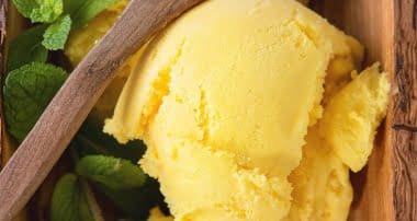 Mango ice cream Print Ingredients 1 ripe mango 1 tbsp sugar 1 cardamom pod 300ml double cream Method Peel the mango, remove pulp and mash with 1 tbsp sugar and the seeds from 1 cardamom pod. Put the cream in a bowl and whisk until thick and stiff. Fold through the mango mix, pour into a freezer tub and freeze 3 hours minimum. Serve with mint leaves. 3.5.3208