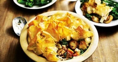 Mushroom, spinach, kale and sweet potato pie Print Serves: 4 Ingredients 2 tbsp olive oil 500g closed cup mushrooms, thickly sliced 2 cloves garlic, crushed 250ml vegetable stock 300g cooked sweet potatoes, cut into chunks 2 tbsp light crème fraîche 250g spinach, wilted 100g kale, cooked 150g feta cheese, cubed salt and freshly ground black pepper 3 sheets filo pastry Method Heat oven to 200C/Gas 6. Heat half the oil in a large non-stick pan and fry mushrooms on … Continue reading Mushroom, spinach, kale and sweet potato pie