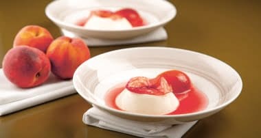 Panna Cotta with Poached Peaches Print Author: Helen Doyle Serves: 6 Ingredients For the Panna Cotta: 900g UHT whipping cream 224g UHT whole milk 2 vanilla pods 224g sugar 2 strips of lemon rind 4 leaves bronze gelatine For the peaches: 6 peaches 250g sugar 125g water 7ml vanilla paste/1 vanilla pod 25ml peach liqueur juice of ½ a lemon Method For the panna cotta, boil together the cream, milk, vanilla, sugar and lemon rind then reduce to a … Continue reading Panna Cotta with poached peaches