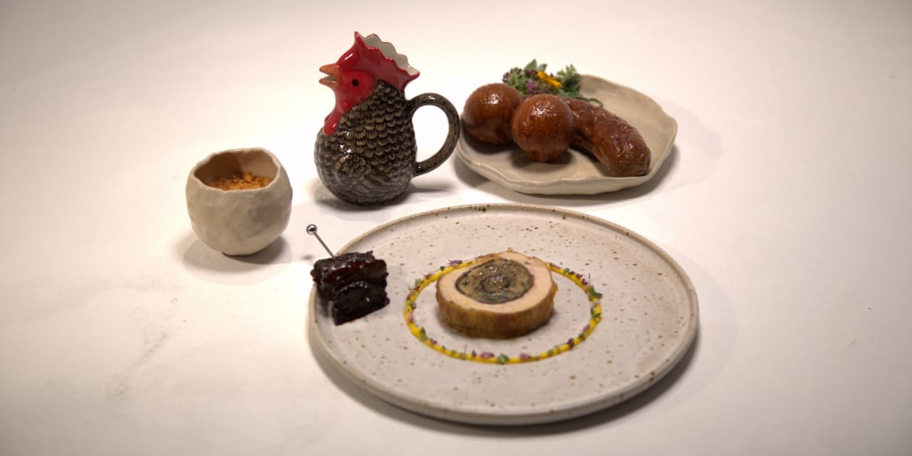 Cal’s main course, The Full Monty, hit all the right notes with the judges, earning him a place at the banquet. The dish consisted of whole guinea fowl deboned and stuffed with a roulade of guinea fowl leg and thigh farce, covered in truffle with a truffle-stuffed morel mushroom centre, guinea fowl sausage served with sweetcorn husk, caramel-glazed milk bun, mushrooms, sweetcorn purée, and a guinea fowl sauce.