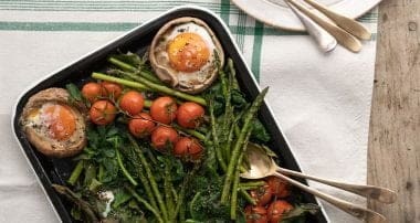 Portobello mushrooms baked with a fried egg inside, with roasted sweet cherry tomatoes and asparagus Print Author: The UK and Ireland Mushroom Producers in partnership with Melissa Hemsley Serves: 2 Ingredients 2 large British Portobello mushrooms 2 small eggs 14 cherry tomatoes on the vine, split in half 8 asparagus spears, ends snapped off. – save ends to make soup or stock 2 tbsp olive oil or ghee or butter 2 handfuls baby spinach or baby spinach and wild … Continue reading Portobello mushrooms baked with a fried egg inside, with roasted sweet cherry tomatoes and asparagus