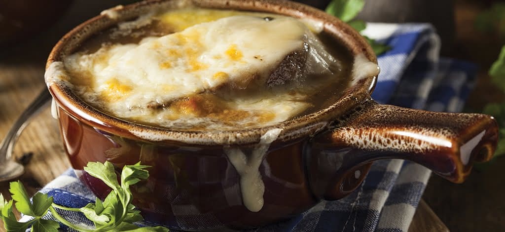 Quick French Onion Soup Print Serves: 4 Ingredients 80g butter 800g onions, peeled and sliced 3 cloves garlic, peeled and crushed 2 tbsp plain flour 1.2 litres good beef stock salt and fresh ground black pepper 4 slices French bread, toasted 100g Gruyere, grated Method Melt the butter in a pan over a medium heat and when foaming add the onions. Fry gently until soft and golden. Add garlic, flour, combine and cook for a few mins. Set aside … Continue reading Quick French Onion Soup