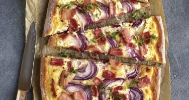 Quick tarte flambee Print Serves: 2-3 Ingredients 250g pizza dough mix 125g smoked bacon lardons 50ml crème fraîche 75g fromage blanc or Quark 1 medium red onion, diced 1 tsp fresh grated nutmeg salt and black pepper olive oil Method Pre-heat oven to 220C/ Gas 7 and line a baking tray with greaseproof paper. Make the dough, roll out thinly and place on prepared baking tray and prick with a fork. Mix the crème fraîche and fromage blanc/Quark with … Continue reading Quick tarte flambee
