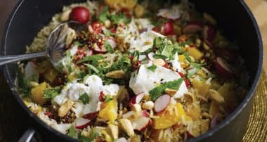 Radish and butternut pilaf with almonds and Greek yoghurt