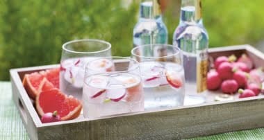 Radish & grapefruit ice cubes for G&T Print Serves: 12 Ingredients 4 radishes, sliced thinly 1 grapefruit, ¼ cut into tiny wedges and the rest squeezed Method Divide radish and grapefruit between a 12-hole ice cube tray, top up each hole in the tray with grapefruit juice, cover with water and freeze until solid. Keep in a plastic bag in the freezer. (recipe: www.lovethecrunch.com) 3.5.3208
