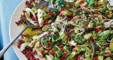 Red camargue & wild rice salad with chicken & avocado Print Author: Jane Lovett Serves: 6 Ingredients 250g red Camargue rice or a mix of red Camargue and wild rice sea salt freshly ground black pepper 2 tbsp pumpkin seeds 6 boneless, skinless chicken thigh fillets, trimmed of fat olive oil 4 celery sticks, stringy bits removed, thinly sliced on a deep diagonal 1 large or 2 small ripe avocados, halved, stoned and diced (in their skins) 4 spring … Continue reading Red camargue & wild rice salad with chicken & avocado