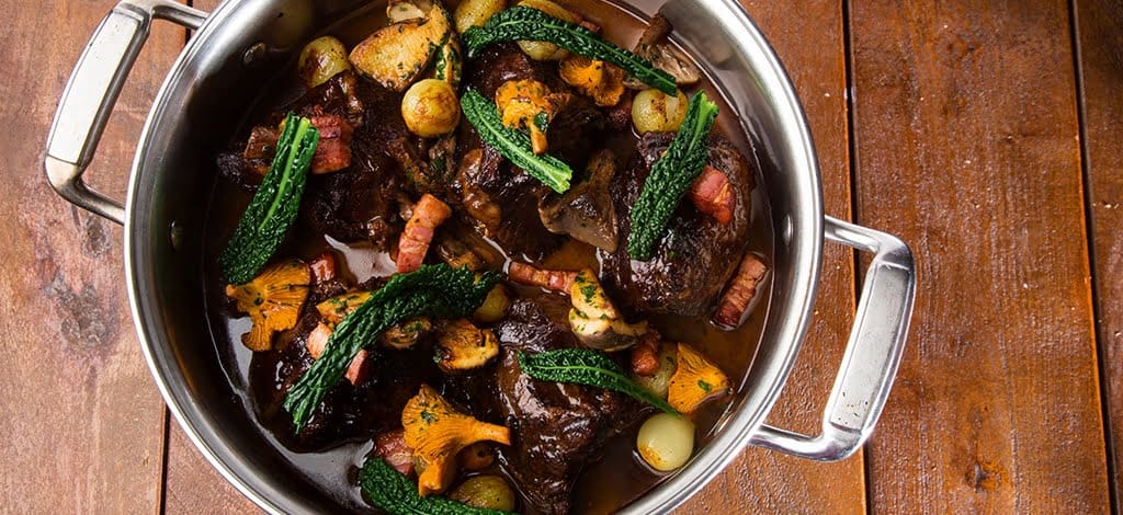 Red wine braised beef cheeks with glazed onions, smoked bacon and wild mushroom