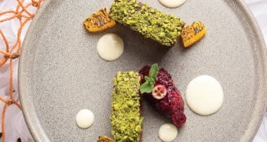 Rich chocolate sponge with orange custard, cranberry compote and pistachios Print Author: Martin Charlton Serves: 10 Ingredients For the chocolate sponge: 302g dark chocolate (70%) 136g butter 131g egg yolk 286g egg white 95g caster sugar 50g flour For the orange custard: 200ml double cream 700ml milk 2 oranges, zest and segments 4 egg yolks 3 tbsp cornflour 200g sugar For the cranberry compote: 500g frozen cranberries 50g sugar 50g water For the garnish 100g pistachios Method Melt together … Continue reading Rich chocolate sponge with orange custard, cranberry compote and pistachios