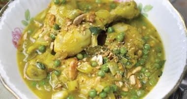 Saffron braised chicken with peas, almonds and garlic Print Serves: 4 Ingredients 3 tbsp olive oil 4 free-range chicken legs, halved 4 shallots, chopped 2 sticks celery, chopped 4 cloves garlic, sliced 1 tbsp flour 200ml dry sherry pinch of saffron 600ml chicken stock 2 bay leaves salt and pepper 150g peas small bunch flat leaf parsley, chopped 100g toasted almonds, roughly chopped Method In a large casserole pan, fry the chicken in olive oil for 2-3 mins until … Continue reading Saffron braised chicken with peas, almonds and garlic