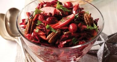 Cranberry and cabbage winter slaw with pecans Print Author: www.berryworld.com Serves: 6 Ingredients 150g fresh cranberries 50g caster sugar, plus 2 extra heaped tsp 1 orange, juice and zest 2 tbsp red wine vinegar 50g pecans 15g butter ½ large red cabbage, finely sliced 3 shallots, peeled and finally sliced 2 carrots, peeled and grated 1 Pink Lady apple, cored, cut into thin slices 2 tbsp flat leaf parsley, finely chopped 2 tbsps olive oil Method Place the cranberries … Continue reading Cranberry and cabbage winter slaw with pecans