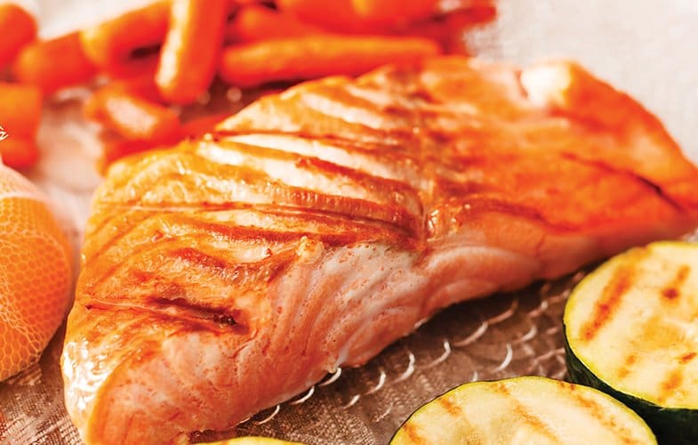 Terryaki salmon fillet with parsnip chips and roast vegetables
