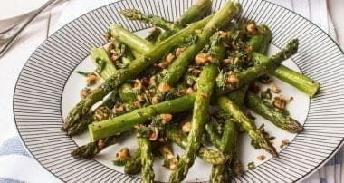 Vegan roasted asparagus with hazelnut gremolata