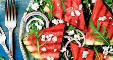 Watermelon, red onion, rocket and feta salad Print Serves: 4-6 Ingredients ½ large watermelon 100g fresh rocket 100g feta cheese 1 small sweet red onion balsamic vinegar to serve Method Cut the watermelon into triangles, de-seed and arrange on a serving dish with the rocket, then sprinkle over the red onion and feta. Serve with balsamic vinegar. 3.5.3208