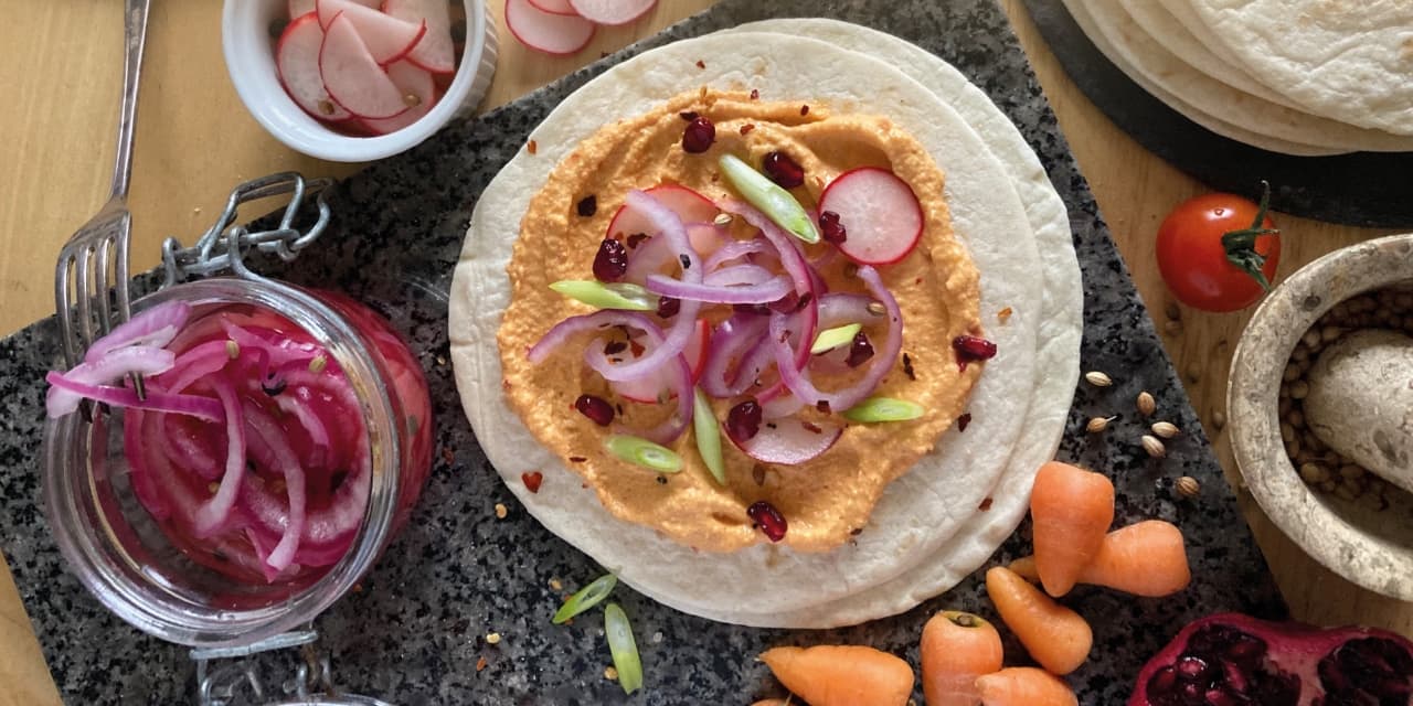 For a speedy sweet and sour red onion pickle, simmer apple cider vinegar with a little sugar and salt, a few black peppercorns, coriander seeds and a bay leaf until the salt and sugar have dissolved – then remove from the heat. Slice an onion and place in a sieve. Pour over boiled water and drain well. When cooled slightly, spoon the onion into sterilised jars, pour over the warm vinegar, seal and allow to cool and pickle for at least two hours. Use this as a topping for hummus alongside pomegranate seeds and fresh herbs – or to add piquancy to salads or wraps. It makes a great gift too!